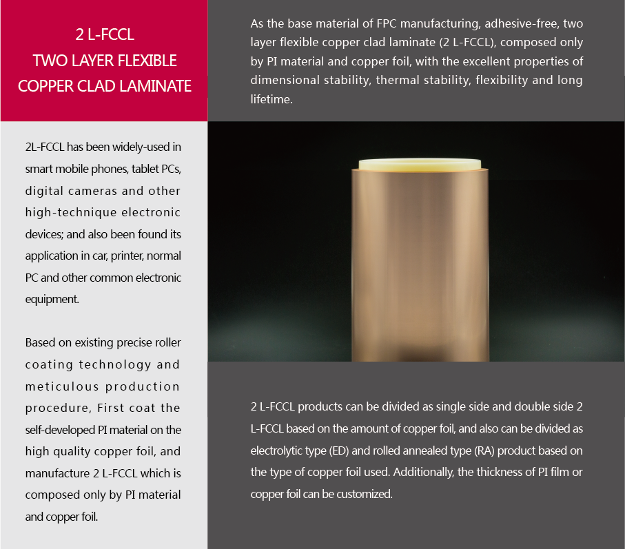 FLS & FLD series 2L-FCCL is supplied in standard widths of 250mm (9.84in) or 500mm (19.68in). Roll length is 50m (164 ft) or 100 m (328 ft) on a core. Other sizes are available by special order.