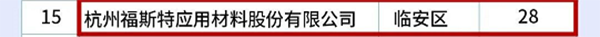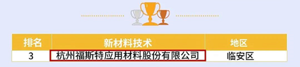 受浙江省高新技術企業協會委托,浙江省科技信息研究院組織開展高新技術企業創新能力評價工作。通過多指標的綜合對比,評選出2020年浙江省高新技術企業創新能力百強,福斯特排名28。此外,在新材料技術榜單十強榜單中,福斯特成為全市唯一入選企業。