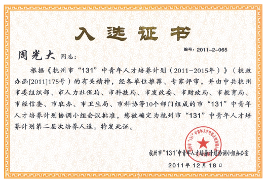 福斯特 技術總監周光大博士入選杭州市“131”中青年人才培養計劃