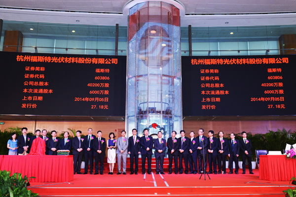 9月5日上午,杭州福斯特光伏材料股份有限公司在上海證券交易所A股主板市場(chǎng)成功登陸。公司本次公開(kāi)發(fā)行6000萬(wàn)股股票,證券簡(jiǎn)稱(chēng):“福斯特”,證券代碼:“603806”。