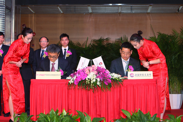 上海證券交易所總經(jīng)理助理夏建亭與福斯特董事長(zhǎng)林建華簽署《證券上市協(xié)議》