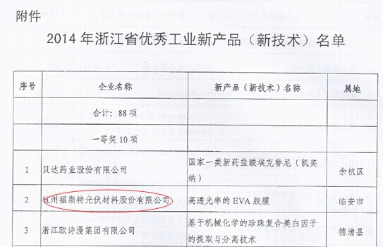 日前,浙江省經信委、財政廳聯合下發《關于公布2014年浙江省優秀工業新產品(新技術)名單的通知》,福斯特產品“高透光率的EVA膠膜”榮獲一等獎,再次奠定了福斯特在光伏封裝材料領域的行業領先地位。