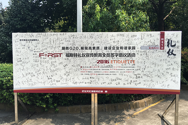 福斯特積極打造健康、和諧、生動的企業文化,以文化活動為載體,豐富員工精神生活,展現企業活力風采。由福斯特企業文化辦公室主辦的福斯特禮儀宣傳教育季活動在G2O期間在全公司開展,以“陽光生活,禮儀先行”為主題,內容包括開設全員培訓課程、開展全員簽字倡議活動活動、學習福斯特《禮儀手冊》,后續還將陸續開展禮儀征文活動,禮儀知識問答和禮儀行為調查活動,在全公司營造濃厚的“禮儀文化”氛圍,號召大家共同做文明有禮的福斯特人,展現良好的企業禮儀風貌迎接G20峰會到來。