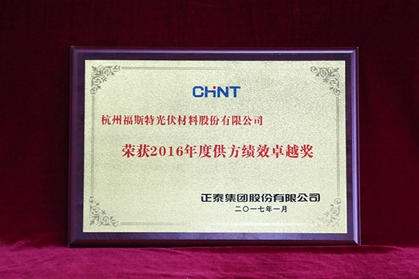 日前,福斯特榮獲正泰集團(tuán)股份有限公司頒發(fā)的2016年度“供方績(jī)效卓越獎(jiǎng)”。