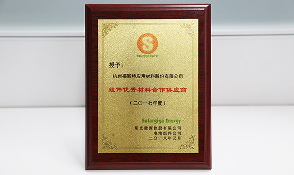 日前,福斯特榮獲錦州陽光能源控股有限公司、錦州陽光能源電池組件公司聯合頒發的2017年度組件優秀材料合作供應商獎。